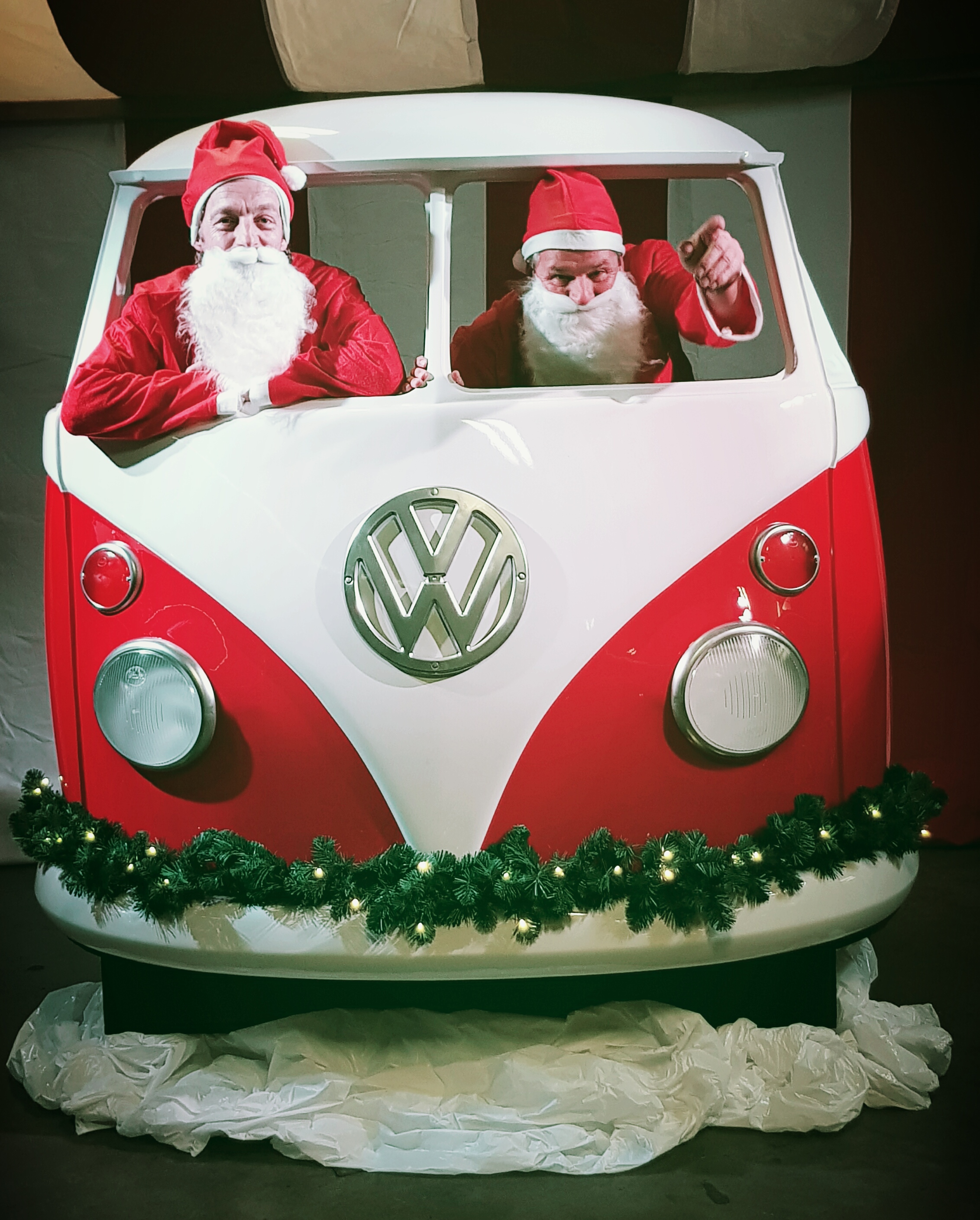 – Kerstmarkt, de DJ Chauffeur komt in Kerst-tenue (Glühweinbus)